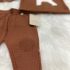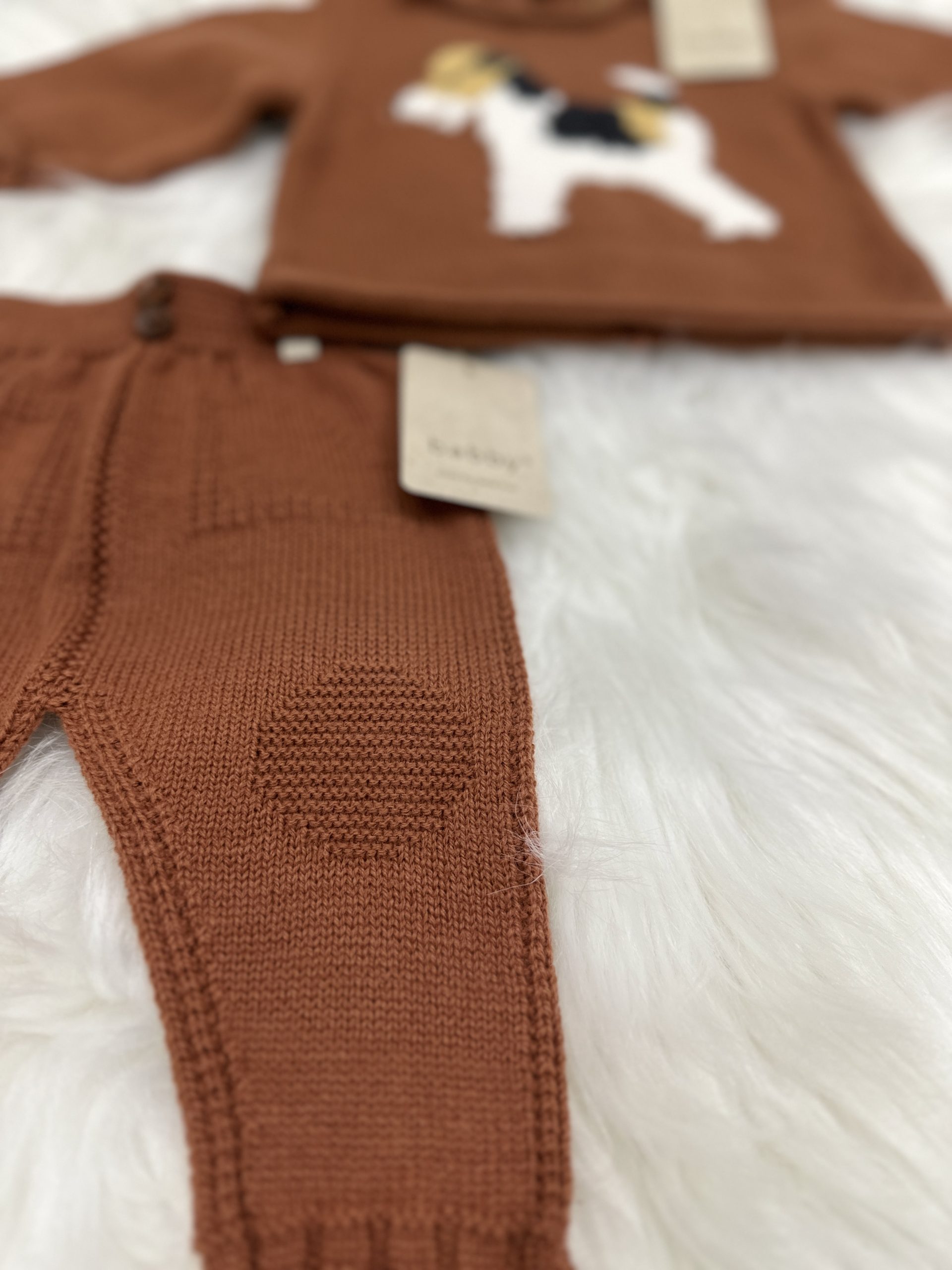 Conjunto de suéter con pantalón largo de punto en color caldera. Bordado perrito y detalles en pantalón.