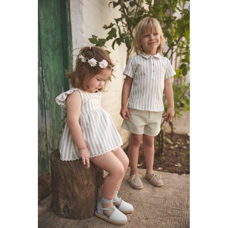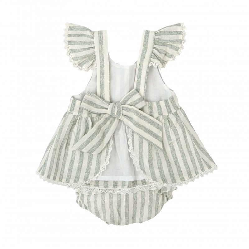 Este encantador vestido ranita para bebé es la combinación perfecta de frescura y elegancia. Confeccionado en tejido ligero con estampado de rayas verdes y beige, su diseño destaca por sus delicadas mangas de volante adornadas con encaje, que aportan un toque romántico y sofisticado. El vestido incluye una braguita a juego con cintura y perneras elásticas para garantizar la máxima comodidad y un ajuste seguro. El bajo del vestido también está decorado con un fino encaje, completando así un look adorable y refinado.