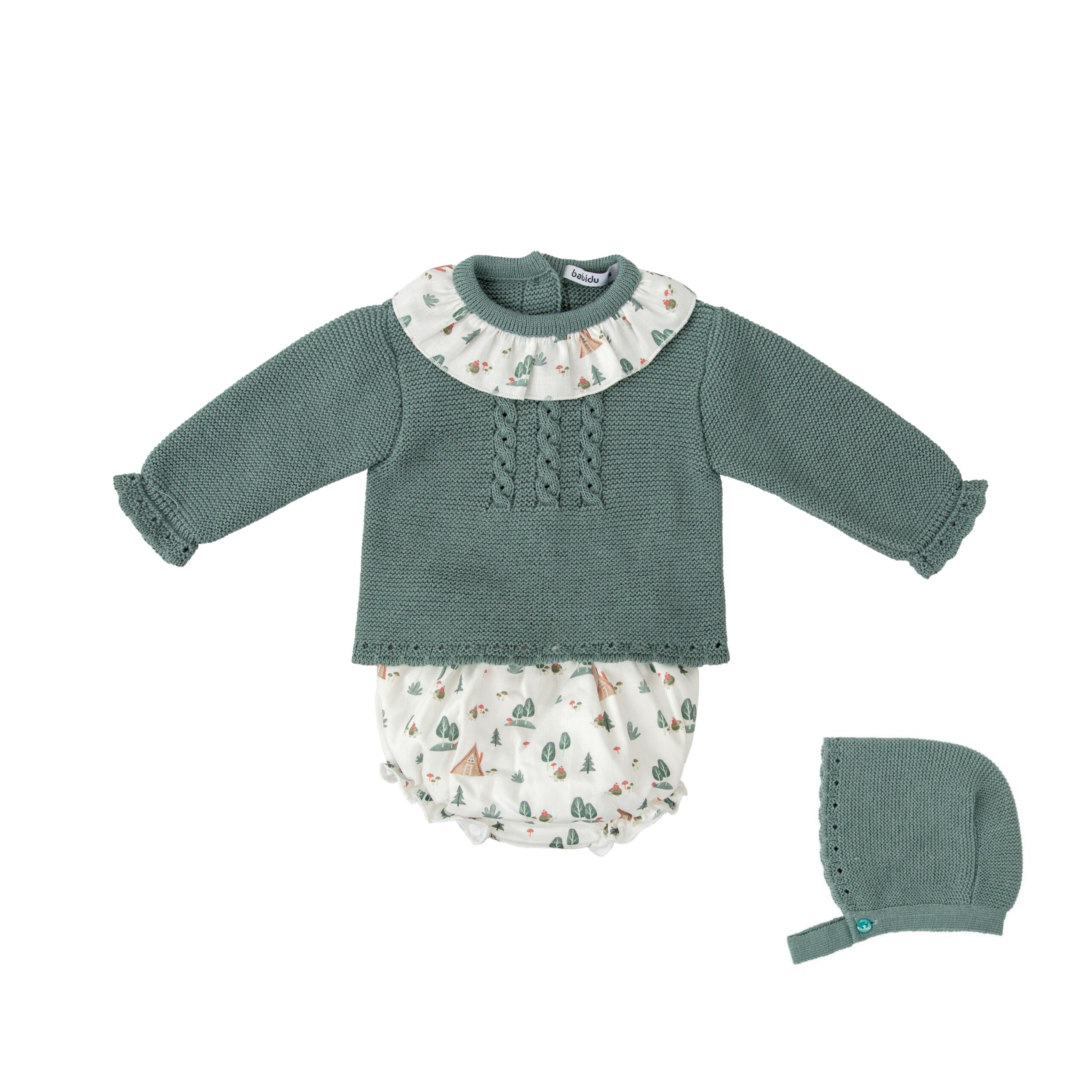 Delicado conjunto de dos piezas compuesto por jersey de punto verde con cuello volante de algodón y braguita a juego. El estampado de tiendas y naturaleza evoca un estilo cálido y campestre ideal para el día a día de los más pequeños.