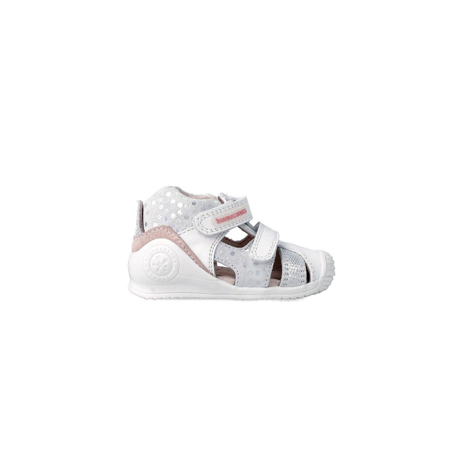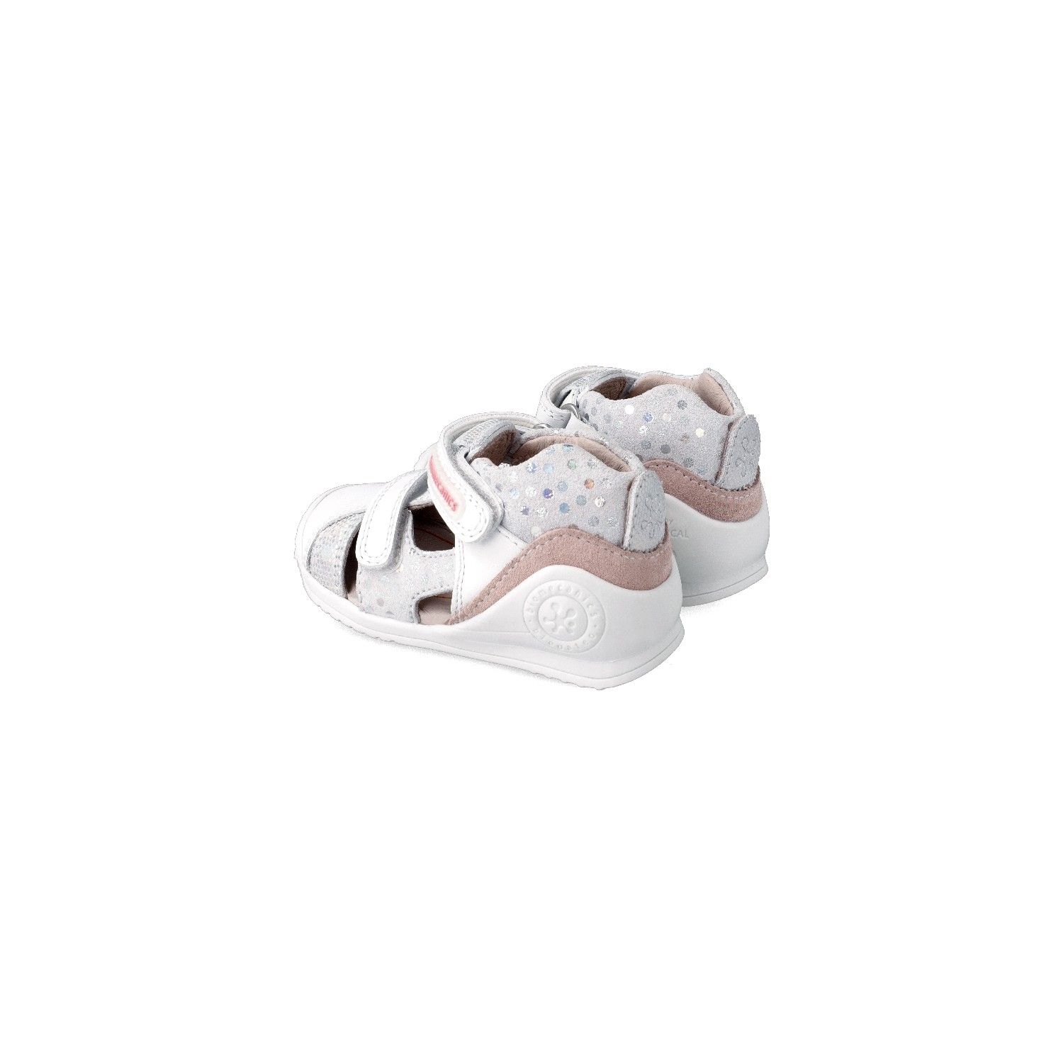 Sandalia cangrejera para bebé. Fabricada en mix de texturas con suela al tono. Destacan sus tiras metalizadas y los pequeños topos que decoran taloneras y laterales.