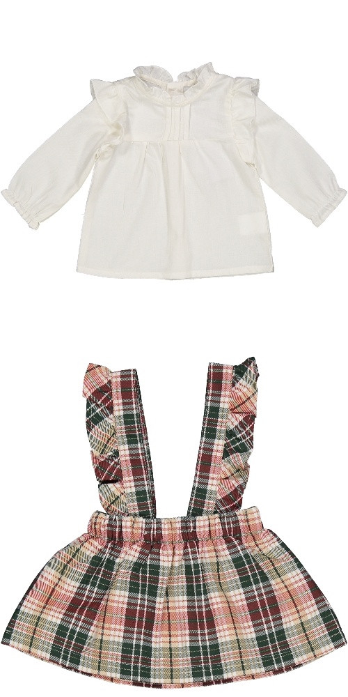 Camiseta volantes de suave y cómodo algodón acompañada de un precioso pichy de cuadros en tonos verdes y granate.