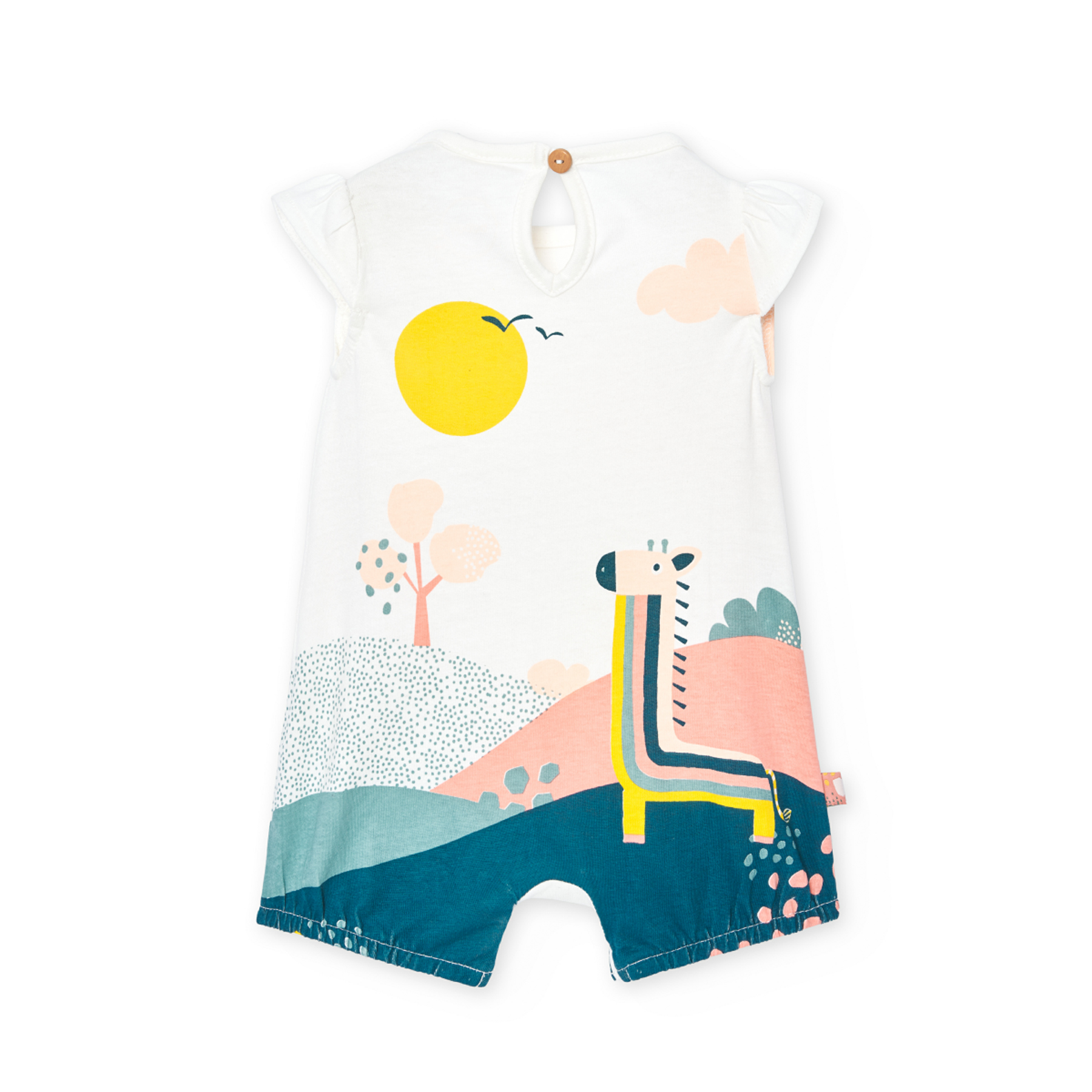 Este pelele de punto para bebé niña es ideal para recién nacidos. Disponible en tallas desde 0 meses hasta 2 años, se adapta perfectamente al crecimiento de tu pequeña. Su tejido de punto es suave y cómodo, perfecto para la delicada piel de los bebés. El estampado añade un toque de diversión y estilo. Con cuello redondo y mangas cortas, es una prenda fresca y ligera para el verano. Su color blanco aporta un aire de inocencia y ternura. Un pelele práctico y bonito para las más pequeñas de la casa.