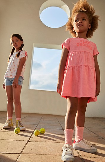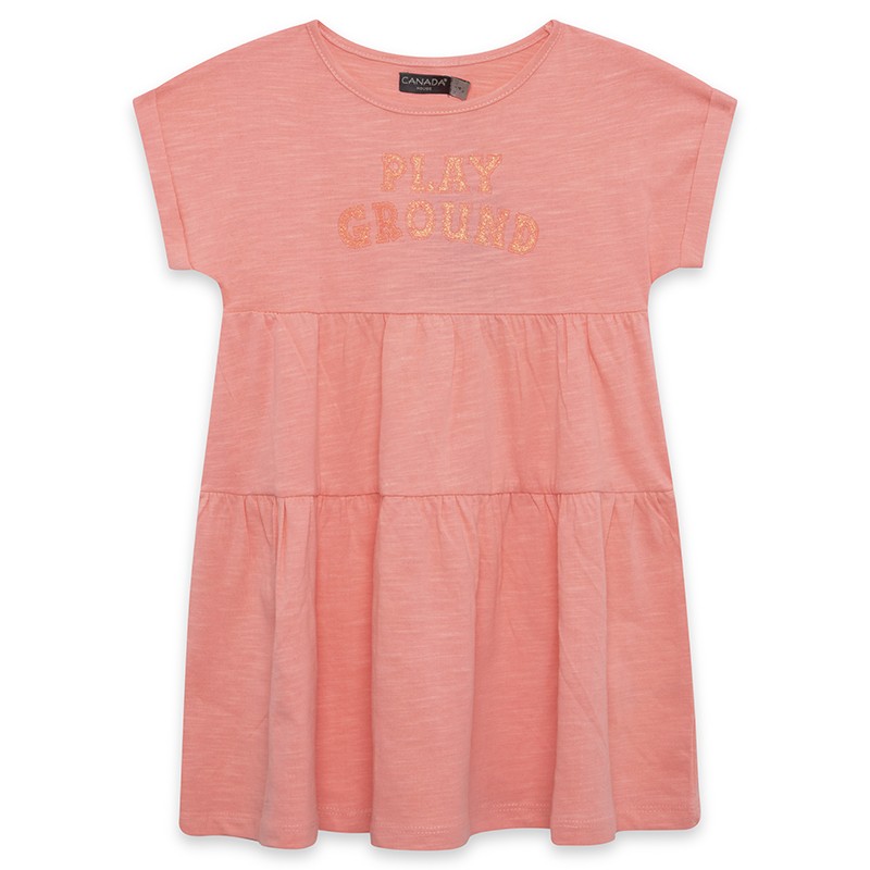 Vestido de niña, de manga corta con dobladillo cosido y cuello redondo. Diseño panelado con costuras fruncidas y letras frontales en glitter PLAY GROUND, 100 % algodón. COMPOSICIÓN: Algodón 100 %
