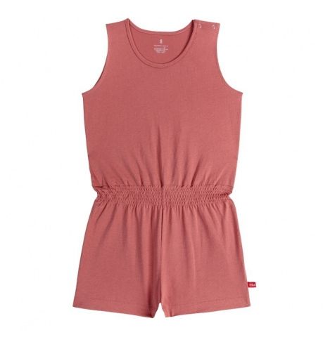Mono corto de niña para playa de punto con smock en la cintura y tirante sport aborchado con corchetes.