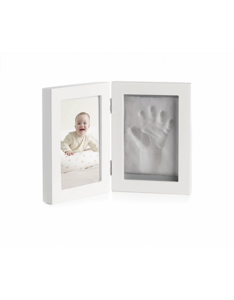 El marco tiene dos frontales, uno para el retrato y el otro para la huella de tu bebé. Cada frontal está separado entre si por articulaciones para que se pueda plegar a la medida que se desee.