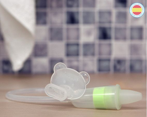 Aspirador nasal, diseñado para aliviar al bebé de las molestias y dificultades para respirar que puede provocarle la obstrucción de las fosas nasales, especialmente en niños pequeños que todavía no saben sonarse solitos. No utiliza perilla sino que con nuestra propia succión, de forma suave, podemos controlar y graduar la intensidad con la que extraer la mucosidad sin molestias para el bebé.