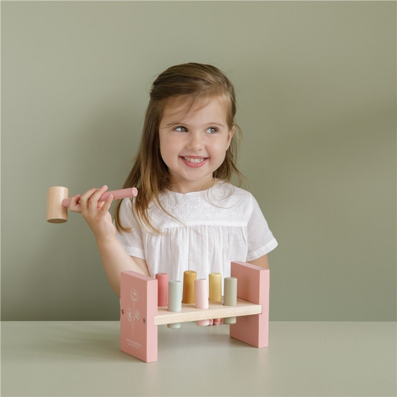 Usa el mazo para golpear las 6 clavijas de colores, un ejercicio perfecto para la motricidad de los niños. Cuando termines, ¡dale la vuelta al banco y empieza de nuevo! ¡Los niños estarán entretenidos durante horas!