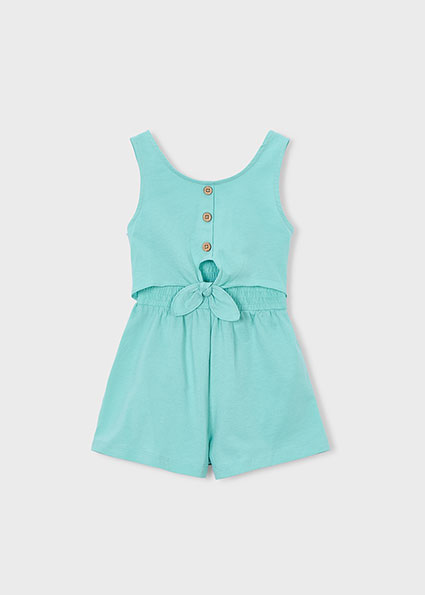 Mono tirantes para chica confeccionado en tejido de algodón. Incorpora tirantes anchos y cuello redondo. Cuenta con nudo decorativo en la parte delantera y pantalón corto con cintura elástica.