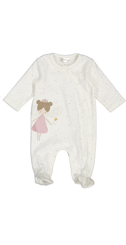 Pijama de manga larga para recién nacido. Cuello redondo. Cierre con botones a presión en la parte delantera. Botones a presión en la entrepierna para facilitar la puesta de la prenda. Diseño estampado.