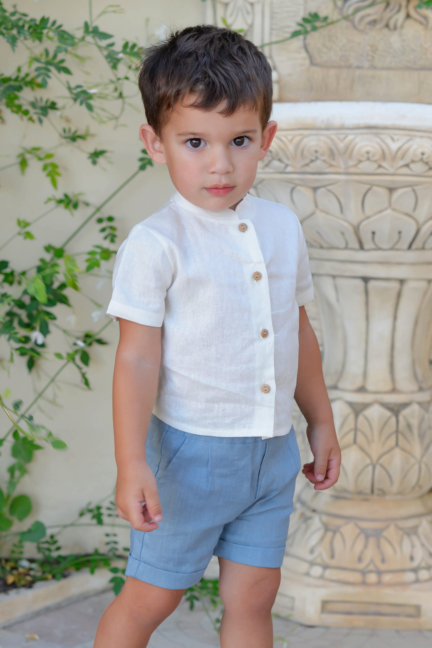 Conjunto de camiseta de lino con cuello maho en color beig y bermuda azul.