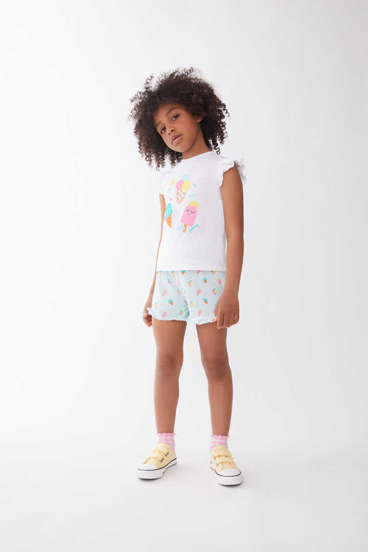 La camiseta blanca, adornada con volantes en las mangas, presenta un divertido estampado de helados en colores vivos, perfecto para días llenos de sol y juegos.