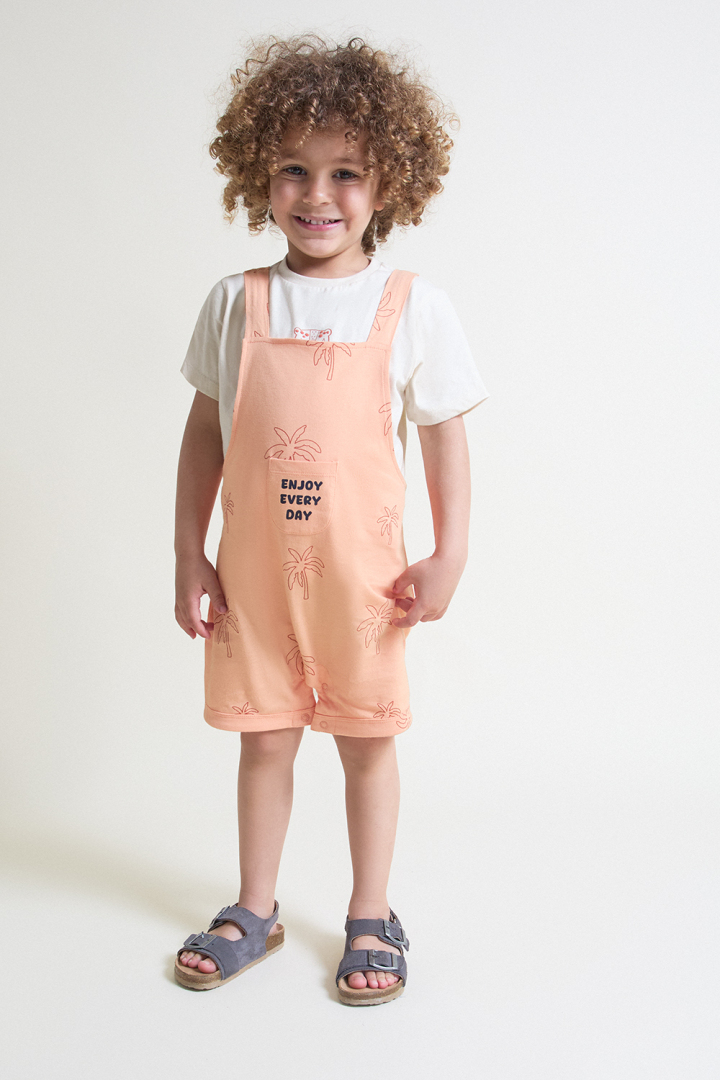 Peto en color melocotón con estampado de palmeras y texto, tirantes abotonados y cierre con botones a presión en la parte inferior.
