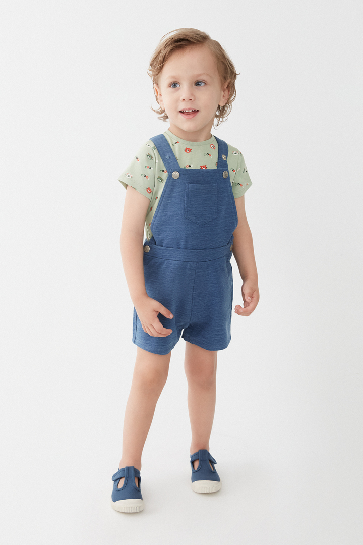 Peto en color azul denim con tirantes ajustables y detalle de bolsillo frontal.