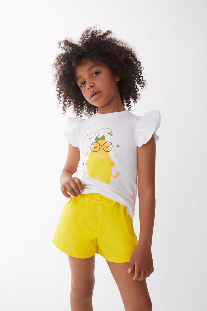 Shorts en color amarillo con cintura elástica de efecto fruncido y detalle de lazo decorativo en el centro.