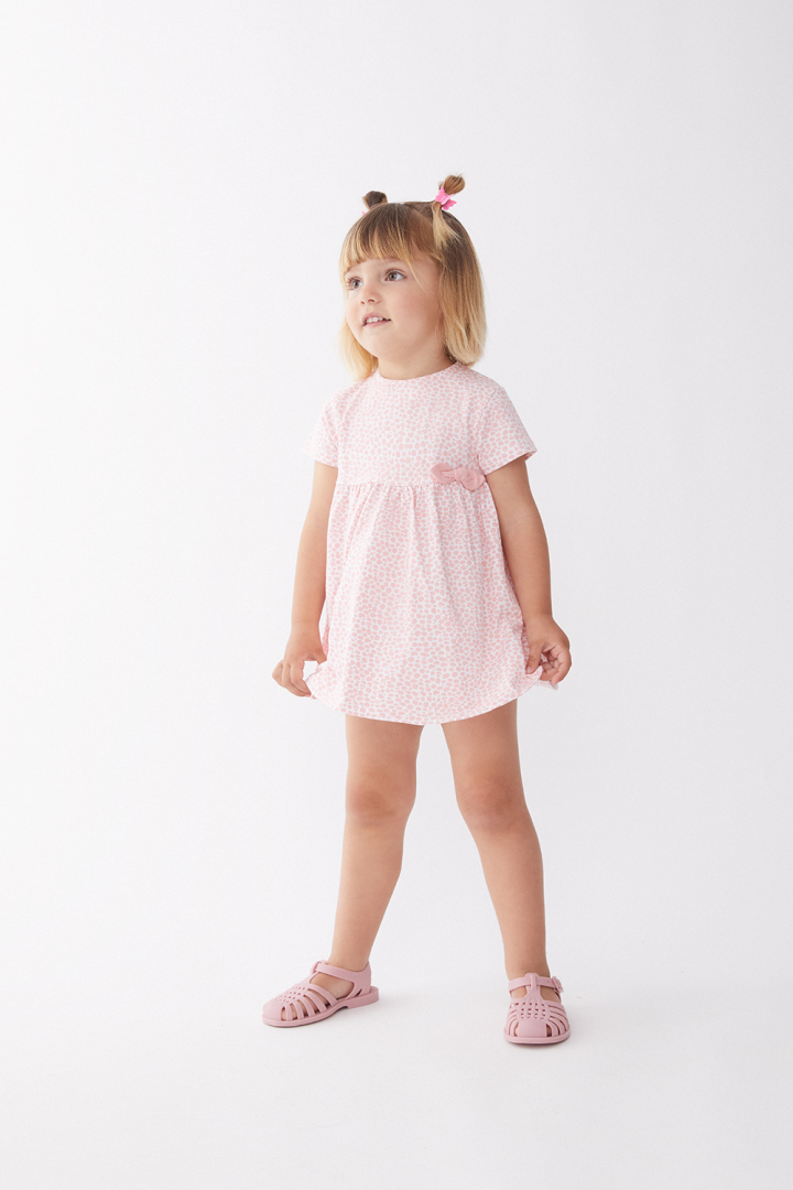 Vestido de manga corta en color blanco con estampado de motas en tonos rosas, aportando un estilo dulce y moderno.